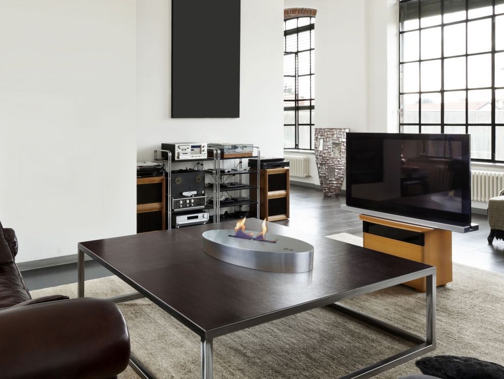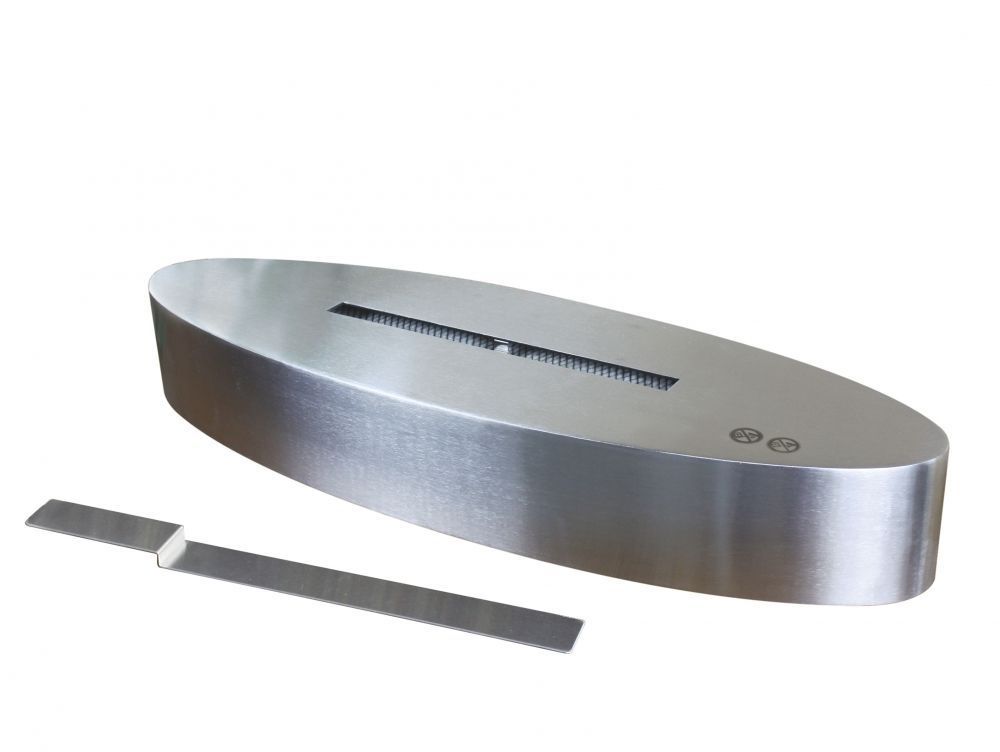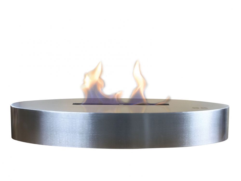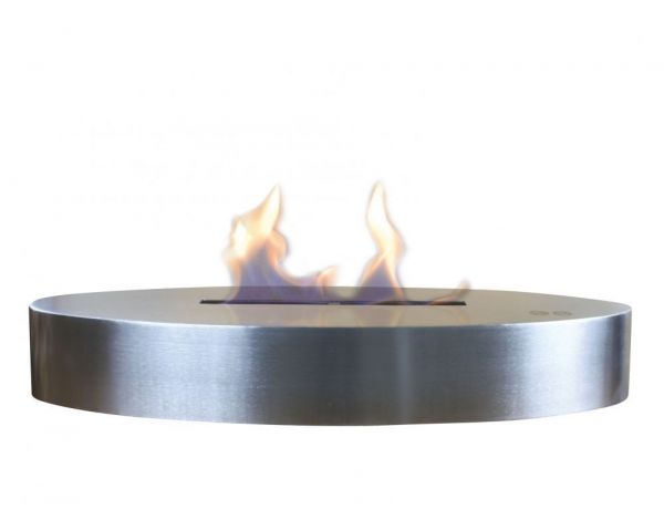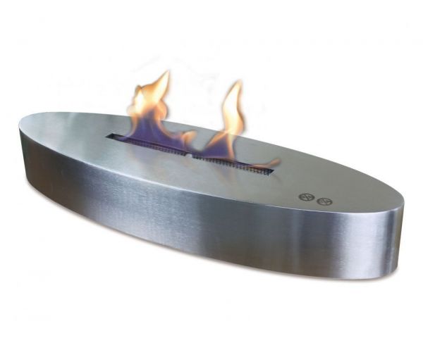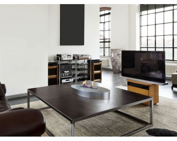 La biochimenea ELECTRA es un modelo fabricado en acero esmaltado, diseñada en color plateado y con una original base ovaladan que contiene un depósito de 3L.