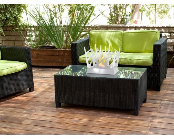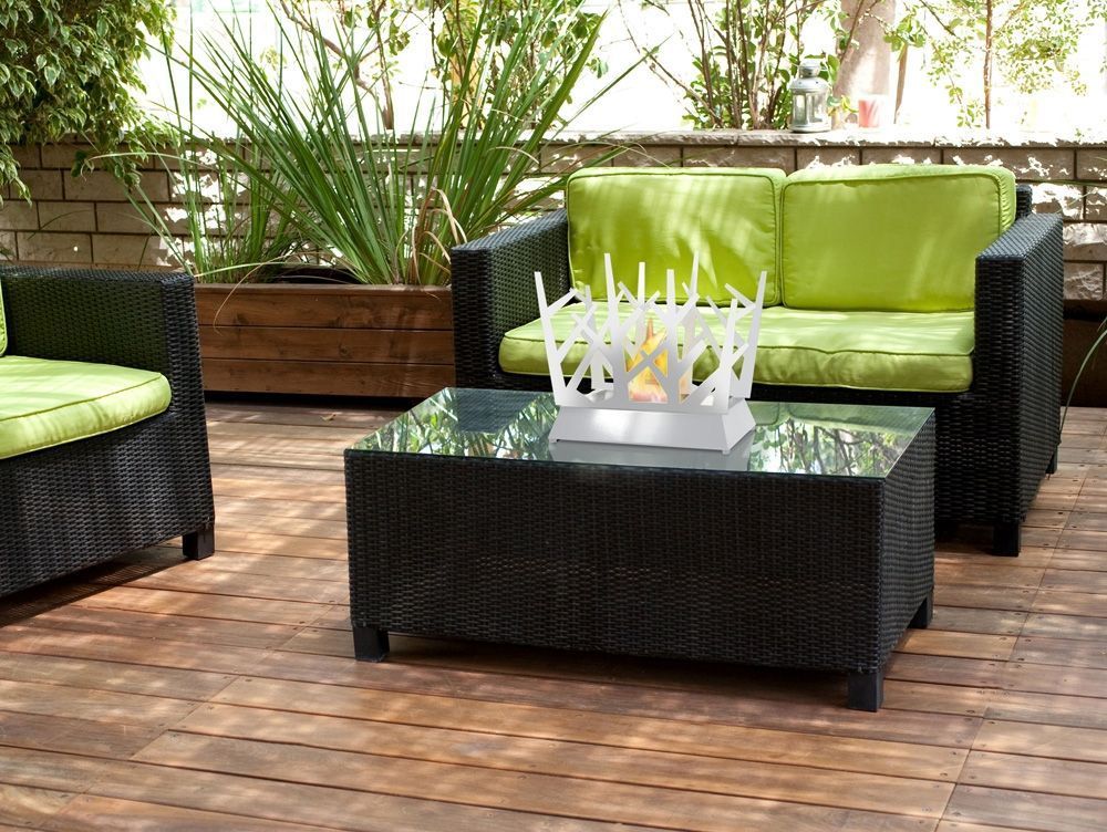 Su tama帽o (LxPxH: 45 x 20 x 43 cm), su ligereza (6kg) y su dise帽o moderno la hacen perfecta para usar en terrazas y jardines, en suelo o sobre muebles, ayudando a crear un ambiente acogedor, c谩lido y genuino.