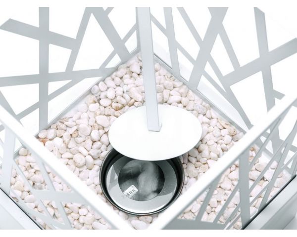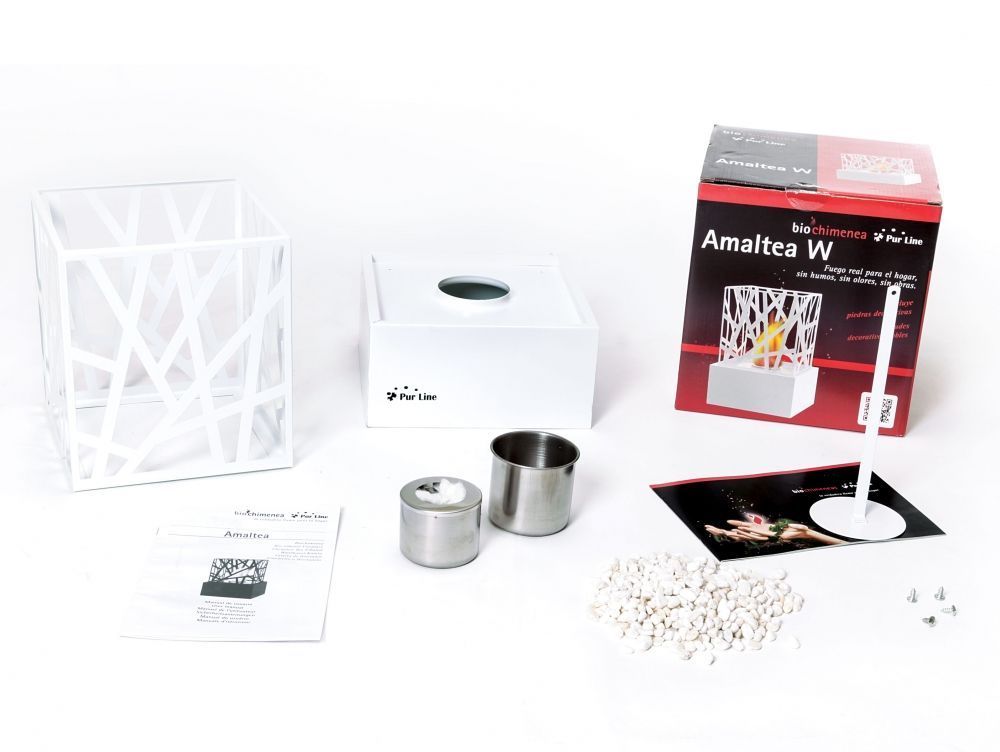 La biochimena AMALTEA W es un modelo exclusivo en acero esmaltado en color blanco, cuyo genuino diseño recuerda simula las ramas de un árbol. Incluye un depósito de 0.3L de capacidad y 0,4kg de piedras decorativas en su interior.
