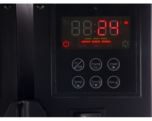 El efecto de las llamas es regulable en altura e independiente del modo calefacción, y todas sus funciones se pueden controlar a través del panel de control superior o del mando a distancia.