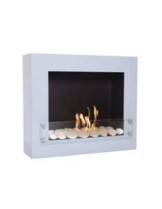 Chimenea de etanol mural en blanco con piedras cerámicas