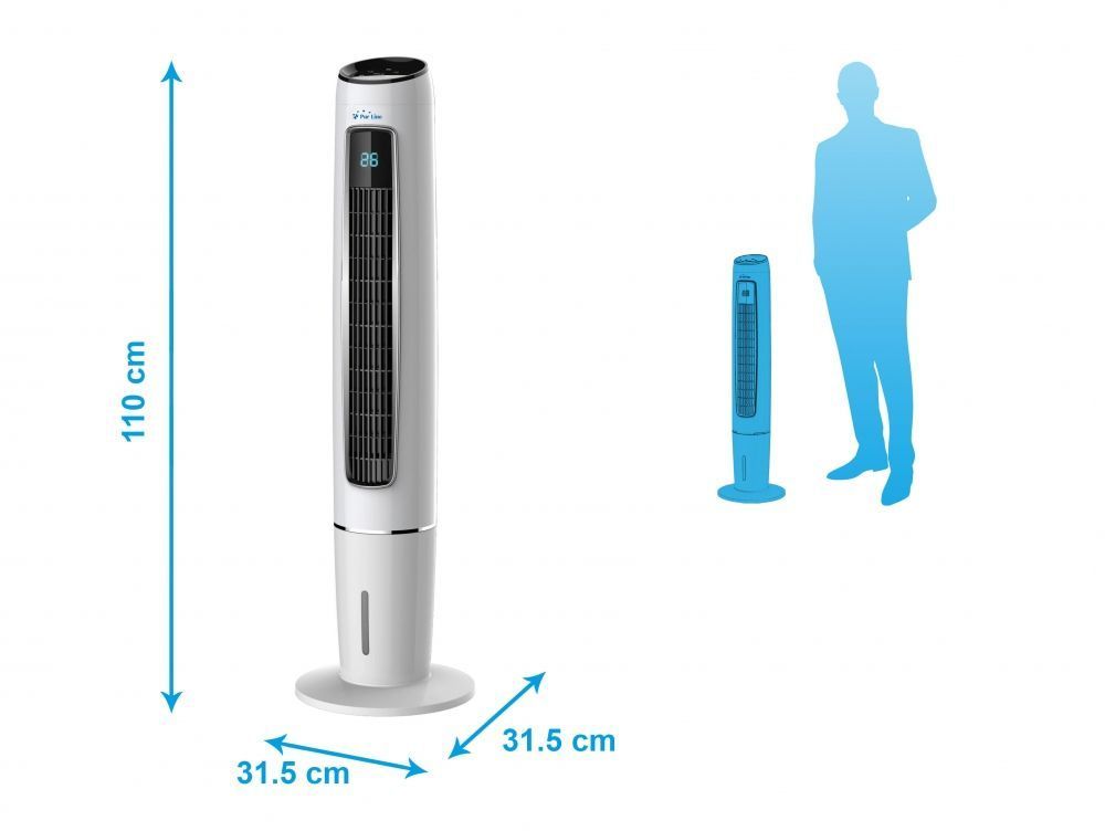 Con un dise帽o compacto en forma de torre, acabado en blanco y detalles en negro, su tama帽o (LxPxH: 31.5 x 31.5 x 110 cm) y su peso (5.3kg) lo hacen ideal para estancias de hasta 15m2, y gracias a sus ruedas lo podr谩s mover seg煤n tus propias necesidades.