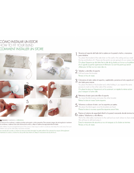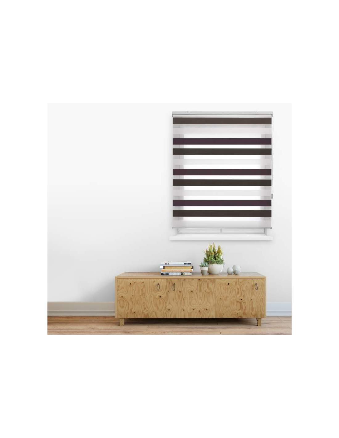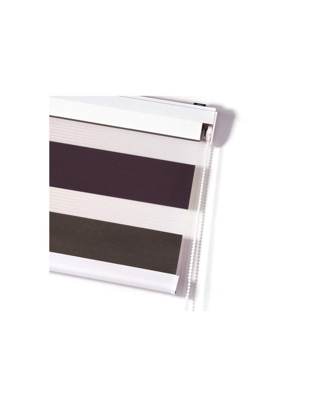 Estor decorativo enrollable, tejido doble Noche y Día tricolor. Ofrecen la posibilidad de elegir la entrada de luz para cada momento, superponiendo las franjas más opacas con las traslúcidas, conseguimos un efecto de luz y color mágico. Dispone de un contrapeso decorativo. Su mecanismo de cadena te permite subir y bajar el estor de una forma fácil y cómoda.