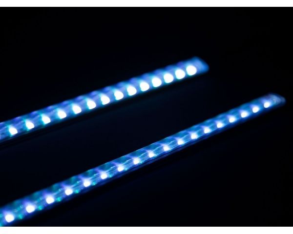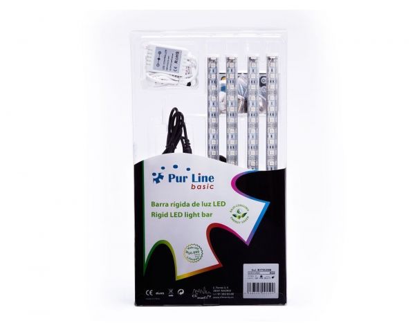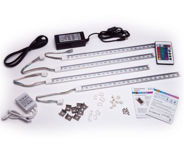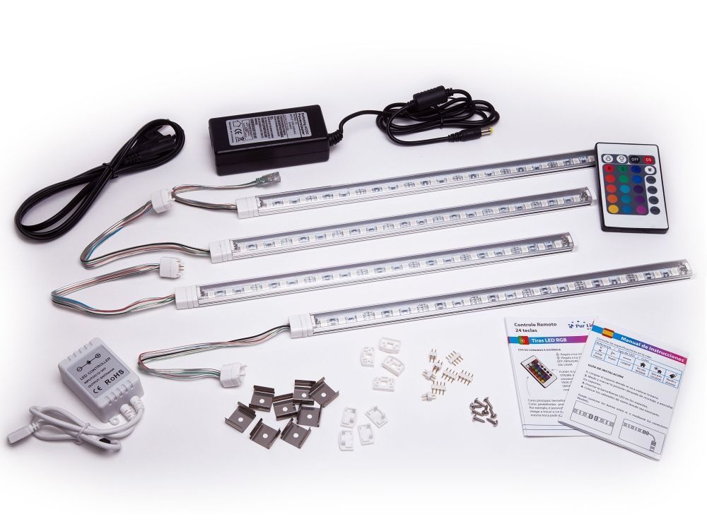 Nota: El kit incluye todo lo necesario para ponerla en funcionamiento en tan sólo unos minutos ya que está compuesto por 4 barras rígidas de LED RGB de 30 cm cada una, el receptor de señal IR, el mando a distancia y la fuente de alimentación.<