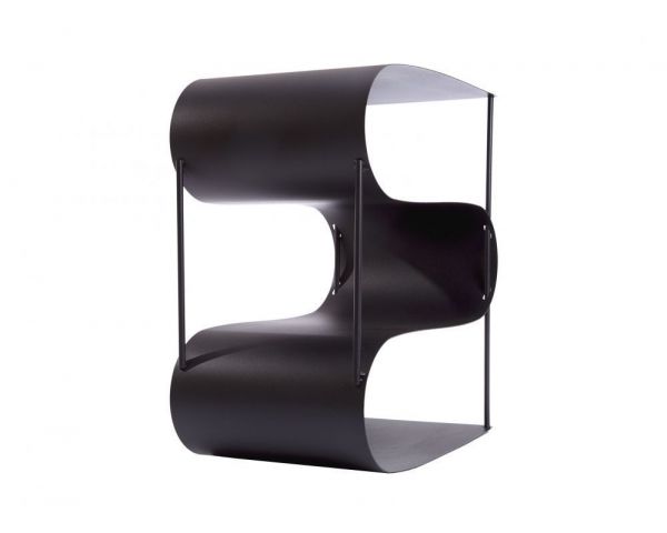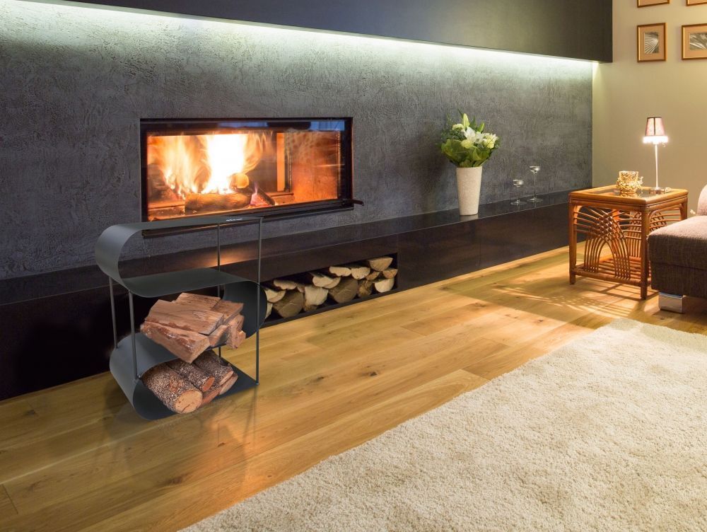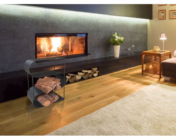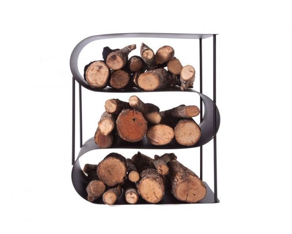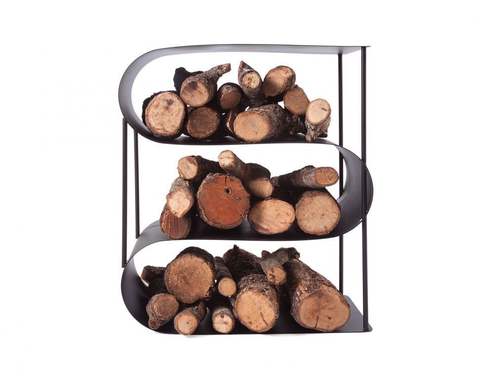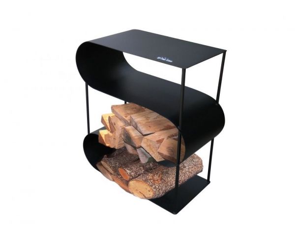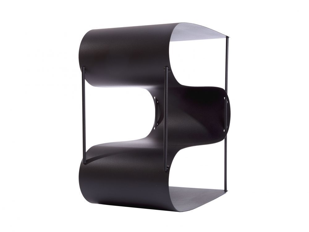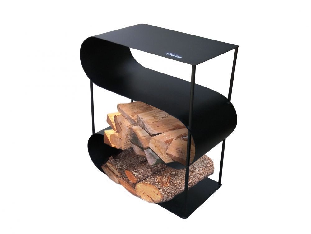 Cajón porta leña de diseño elegante y moderno, fabricado en acero y esmaltado en color negro.